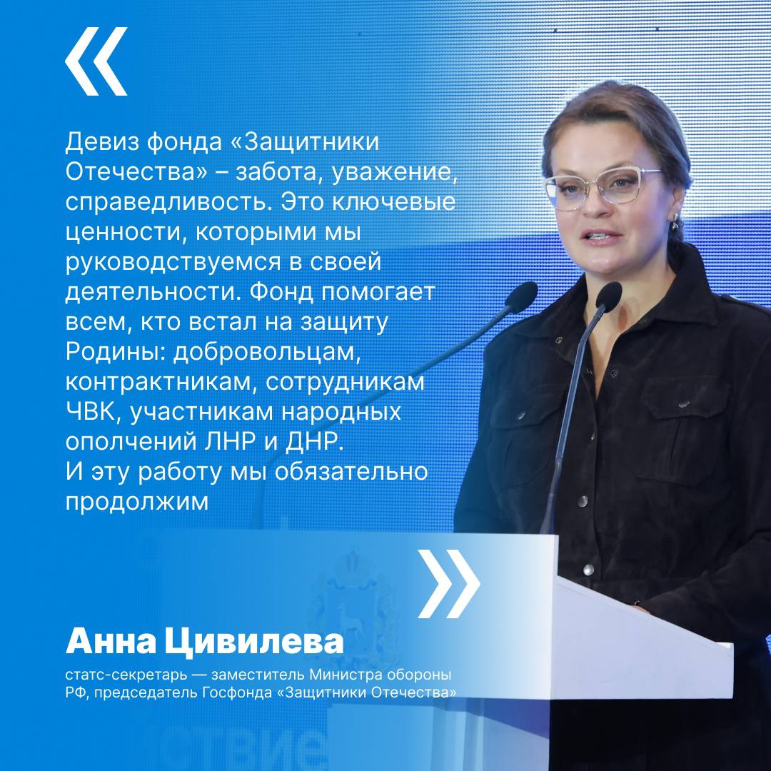 Председатель Фонда Анна Цивилева озвучила инициативу о расширении оказываемой помощи на бойцов, получивших тяжелые ранения, но принявших решение продолжить службу в контуре Минобороны. Предполагается, что они смогут наравне с уволенными участниками спецоперации получать меры поддержки от государства.