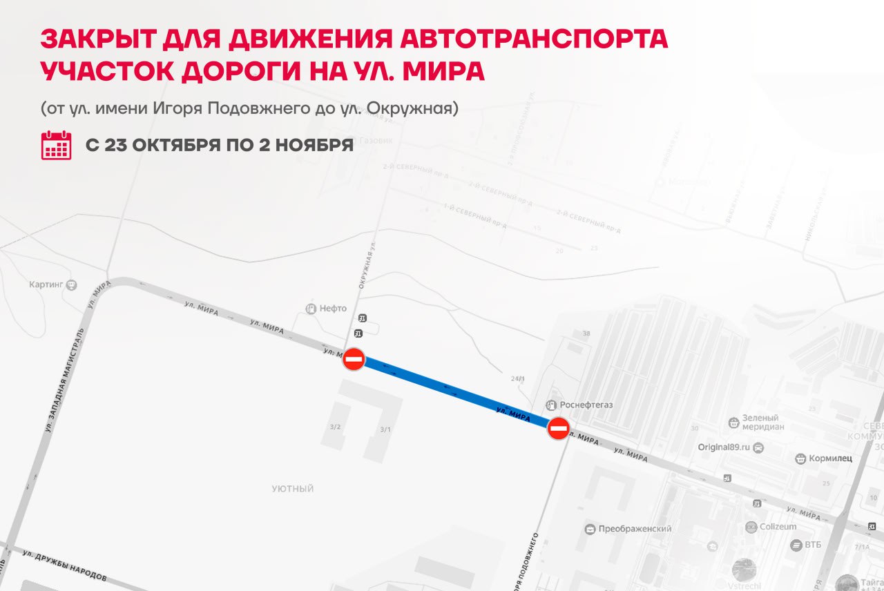 В связи с прокладкой сетей водоотведения с 23 октября по 2 ноября закрывается для движения автотранспорта участок дороги по улице Мира (от улицы имени Игоря Подовжнего до улицы Окружная).