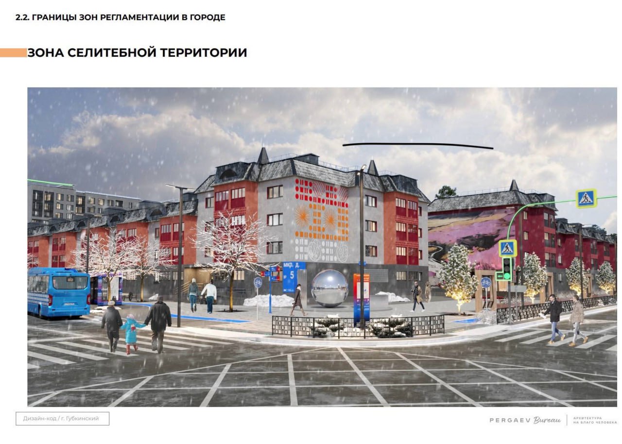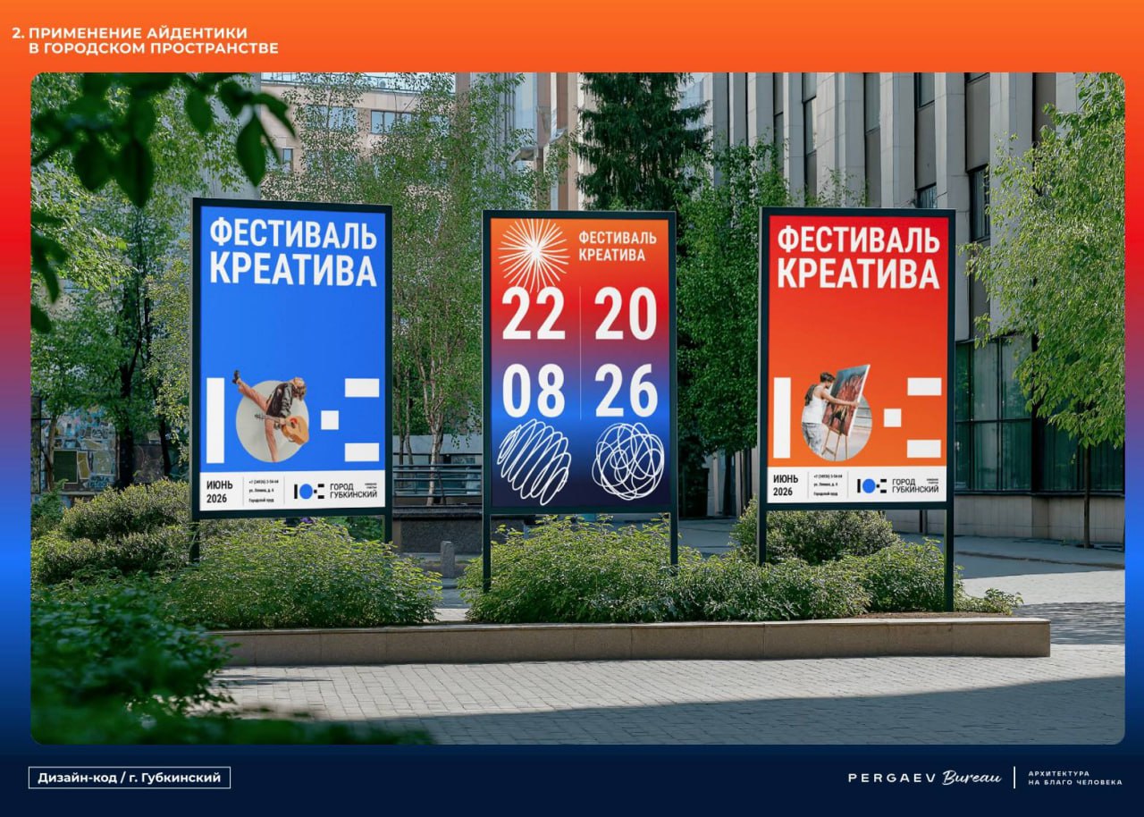 Для Губкинского разработали дизайн-код. В едином стиле будут оформлять вывески, фасады зданий, остановки, навигационные таблички. Базовые цвета — красный, синий и белый.
