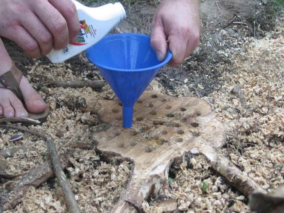 Если пень не исчез до весны, то стоит снять пленку, залить отверстия керосином и поджечь. Селитра в процессе сгорания выделяет кислород, который проникает к корням и уничтожает их. На месте пня останется лишь зола, которую легко убрать.