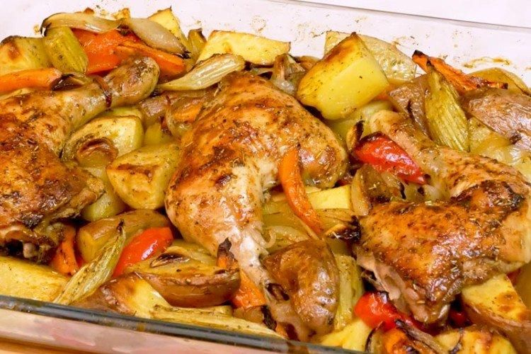 - День 1: запеченная курица с овощами (помидоры, картофель и морковь) в качестве основного блюда. На гарнир – свежий салат.
