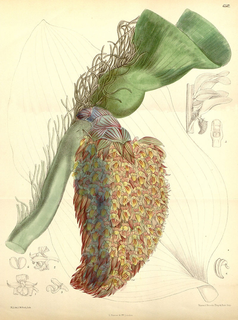 - Bulbophyllum beccarii: Одни из самых крупных орхидей, известные своими массивными цветами и ароматом, напоминающим тухлое мясо. Именно это привлекает мух, главных опылителей этого растения.
