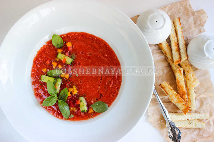 После того как гаспачо готов, его следует накрыть и убрать в холодильник, чтобы он настоялся и приобрел все оттенки вкуса. Для подачи можно приготовить хрустящие сухарики: поджарить белый хлеб на сковороде с оливковым маслом и чесноком до золотистого цвета. В завершение, гаспачо пора сервировать, украсив свежей нарезкой из овощей — мелкими кубиками перца, помидоров и огурца.