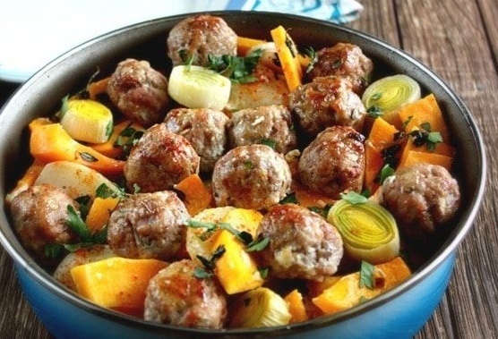 8. Запекайте блюдо 45–55 минут, следя за готовностью картофеля. Перед подачей посыпьте готовую сливочную тыкву с фрикадельками свежей зеленью петрушки.