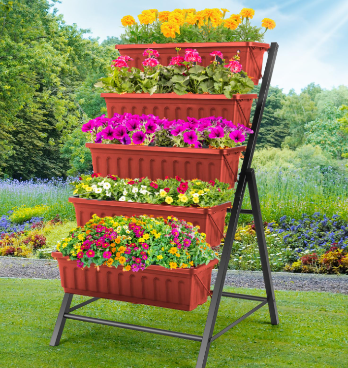 - Вертикальные клумбы: создайте настоящий цветочный каскад, используя старые лестницы, пластиковые бутылки или металлические трубы. Это эффективный способ использовать пространство, даже если участок не слишком велик.