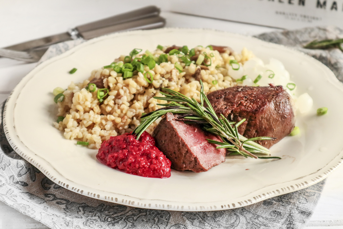 Шаг 1: Начинать следует с булгура: пересыпать его в кастрюлю и залить грибным бульоном. Довести до кипения, затем убавить огонь до минимума и добавить немного соли. Варить 15-20 минут, помешивая, до полного впитывания жидкости. Исключите лишнюю воду, если воспользуетесь дуршлагом. Тем временем разогрейте духовку до 200 градусов. Мясо промокните салфетками, чтобы убрать влагу, но не мойте.