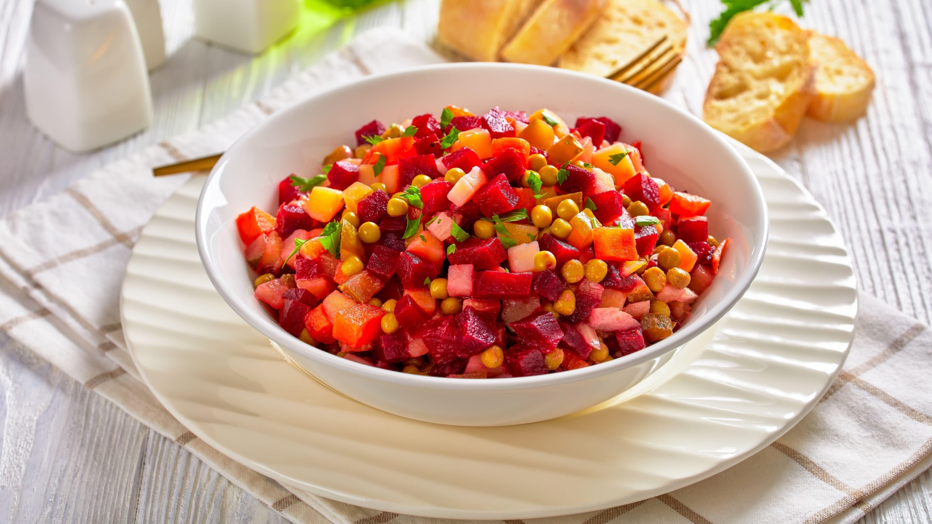 Если только от одной мысли о майонезных салатах начинает крутить живот, самое время устроить разгрузочный день. Отличным блюдом в таком случае станет винегрет. Но не обычный, а из запеченных овощей. Такого вы еще не пробовали!