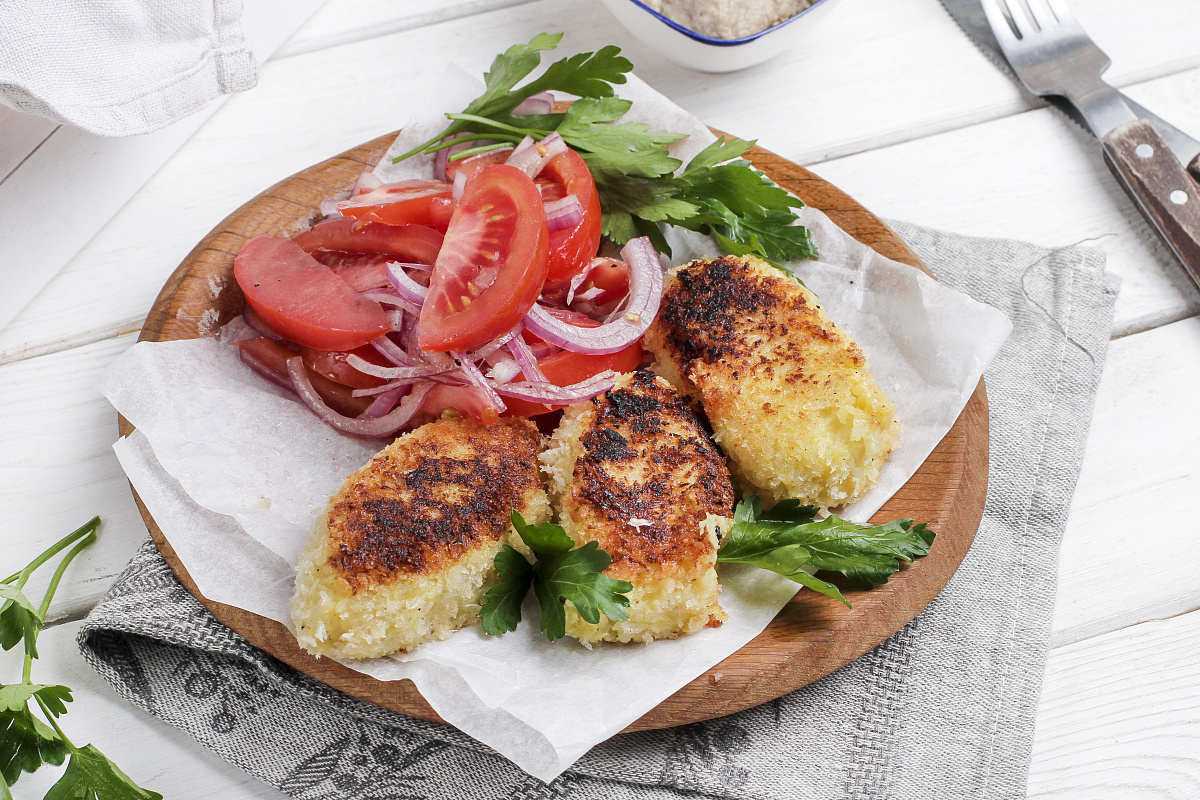 Шаг 2: Тем временем нарезать красный лук соломкой, а помидоры – дольками. В миске объединить красный лук, помидоры, винный уксус и немного растительного масла. Посолить и тщательно перемешать. Подавайте картофельные шайбы горячими, дополнив их свежим салатом и грибным кетчупом.