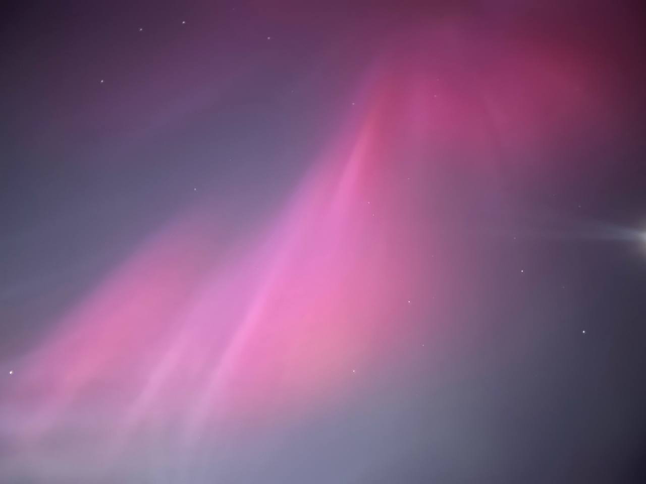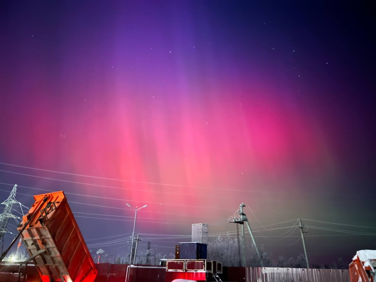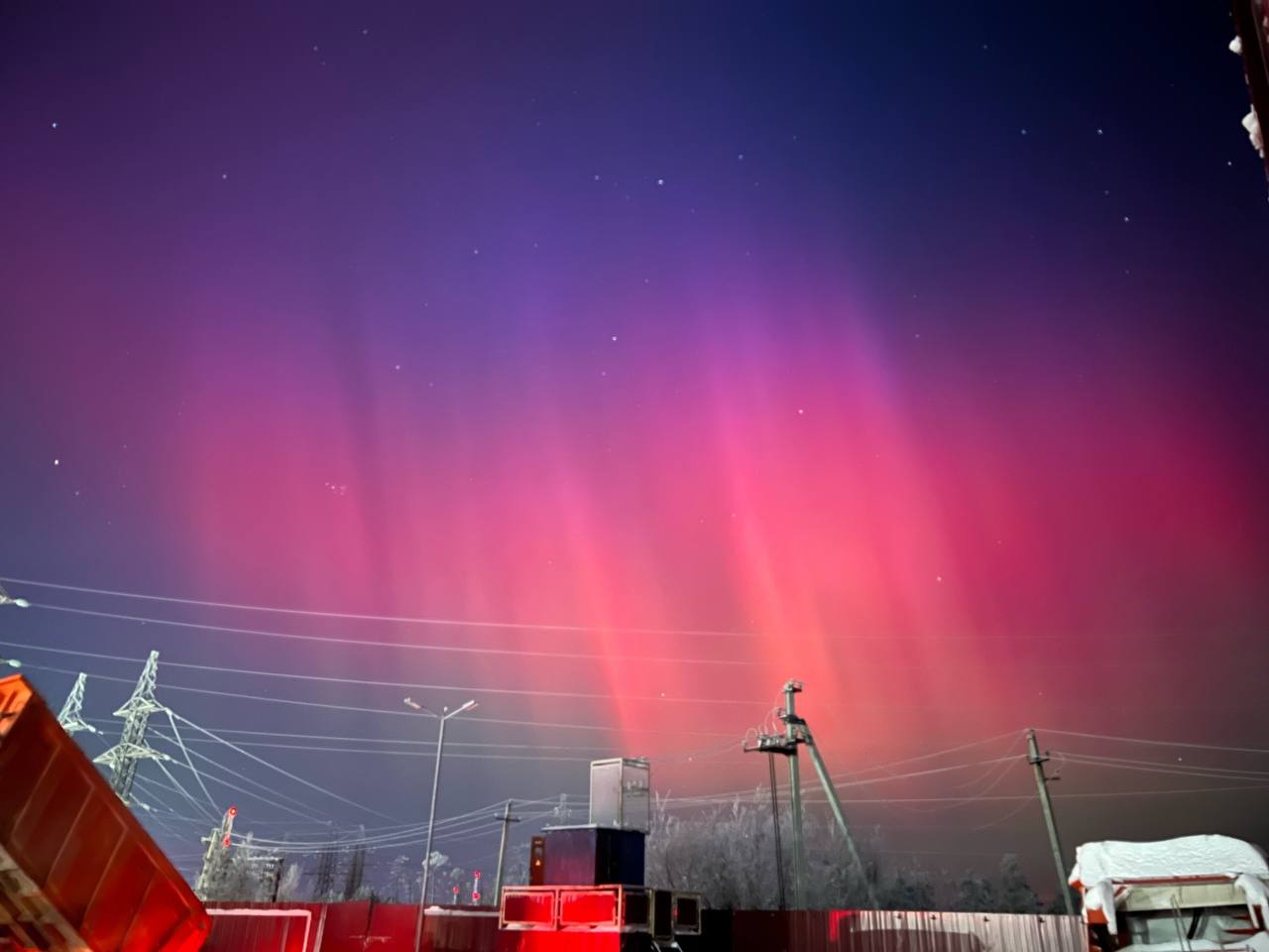 Небо озарилось ярким северным сиянием — розовые и фиолетовые оттенки превратили город в сказку.