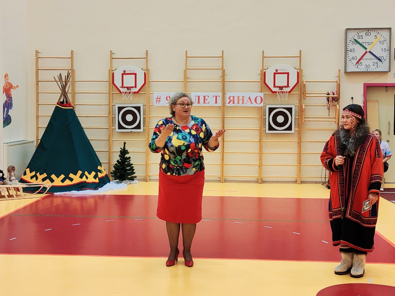 Атмосферу северного края создала хозяйка Ямальской тундры, которая увлекательно рассказала ребятам о богатствах и традициях Северного края. С приветственным словом выступила заведующая детским садом "Улыбка" Елена Викторовна Харченко — она поздравила всех с юбилеем округа.