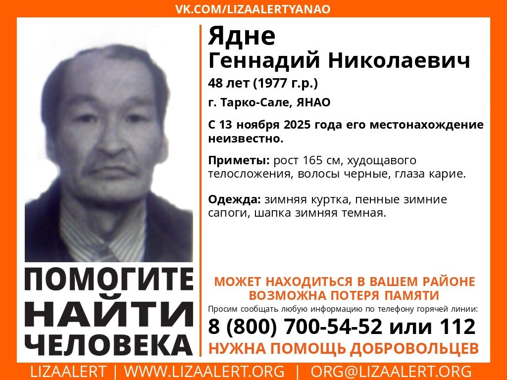 В Тарко-Сале уже неделю ищут 48-летнего Геннадия Ядне, который пропал 13 ноября. Приметы: невысокий рост, худощавое телосложение, темные волосы и карие глаза. Был одет в зимнюю куртку черного цвета.