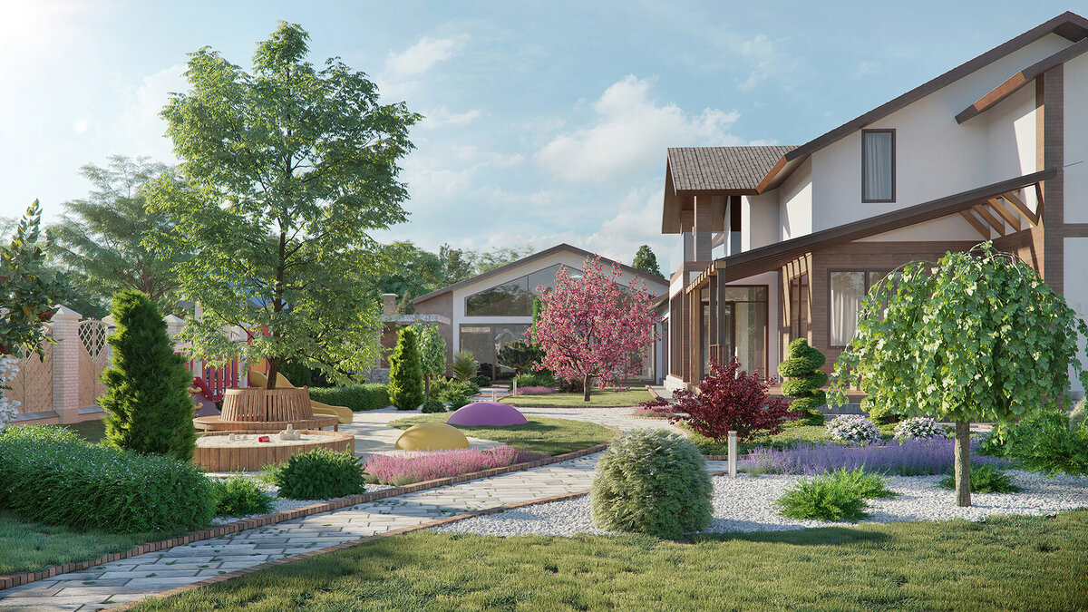 Основное внимание было уделено не только эстетике, но и функциональности. В пределах комплекса предусмотрены игровые площадки для детей, позволяющие маленьким жителям весело проводить время на свежем воздухе. Гранитные дорожки соединяют ключевые зоны: они ведут от дома к игровой зоне и служат приятным способом для таких прогулок по зелёным просторам.