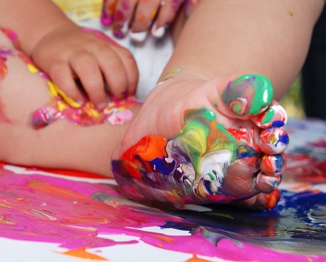 - Выбор материалов: Начинать лучше с красок — это дает возможность малышам свободно эксплуатировать свои идеи. Они могут рисовать руками, смешивать цвета и экспериментировать с формами.