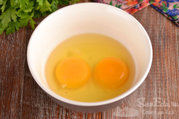 Для этого рецепта отлично подойдет глиняная форма или любая другая жаропрочная посуда. Салатник заполняется сметаной (200 г), добавляется немного соли. На сметану аккуратно разбиваются четыре яйца, снова немного солим. Сверху небольшими кусочками выкладывается сливочное масло (10 г).