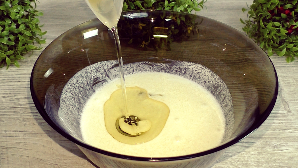 Далее в общем количестве добавляют растительное масло и яйца, после чего смесь снова взбивается. Затем постепенно вводится манная крупа, просеянная мука, разрыхлитель и щепотка соды. Тесто должно иметь приятную, слегка густую консистенцию.