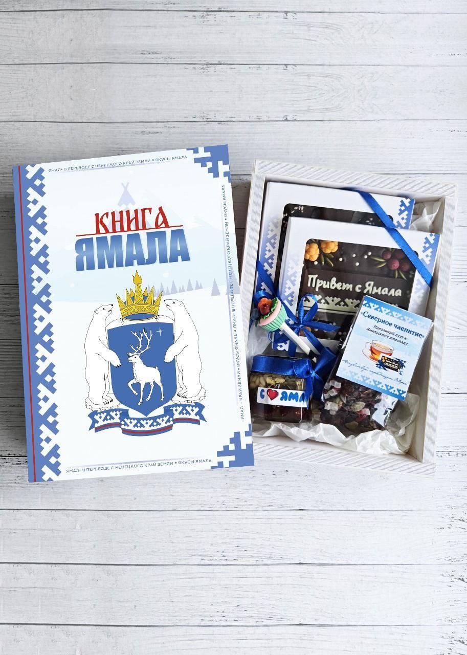 Необычный набор оформлен в виде настоящей книги, которую можно не только прочитать, но и попробовать. На её страницах — интересные факты о Ямале и его традициях, а внутри — вкусные ямальские деликатесы: тёмный шоколад с кедровыми орехами «Привет с Ямала», мёд с орешками, сувенирная ложечка, северный чай и необычные чипсы из оленины в горьком шоколаде.