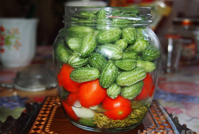 При приготовлении солений многие огородники советуют использовать больше помидоров. Мелотрия в основном украшает блюдо, в то время как помидоры придают насыщенный вкус.