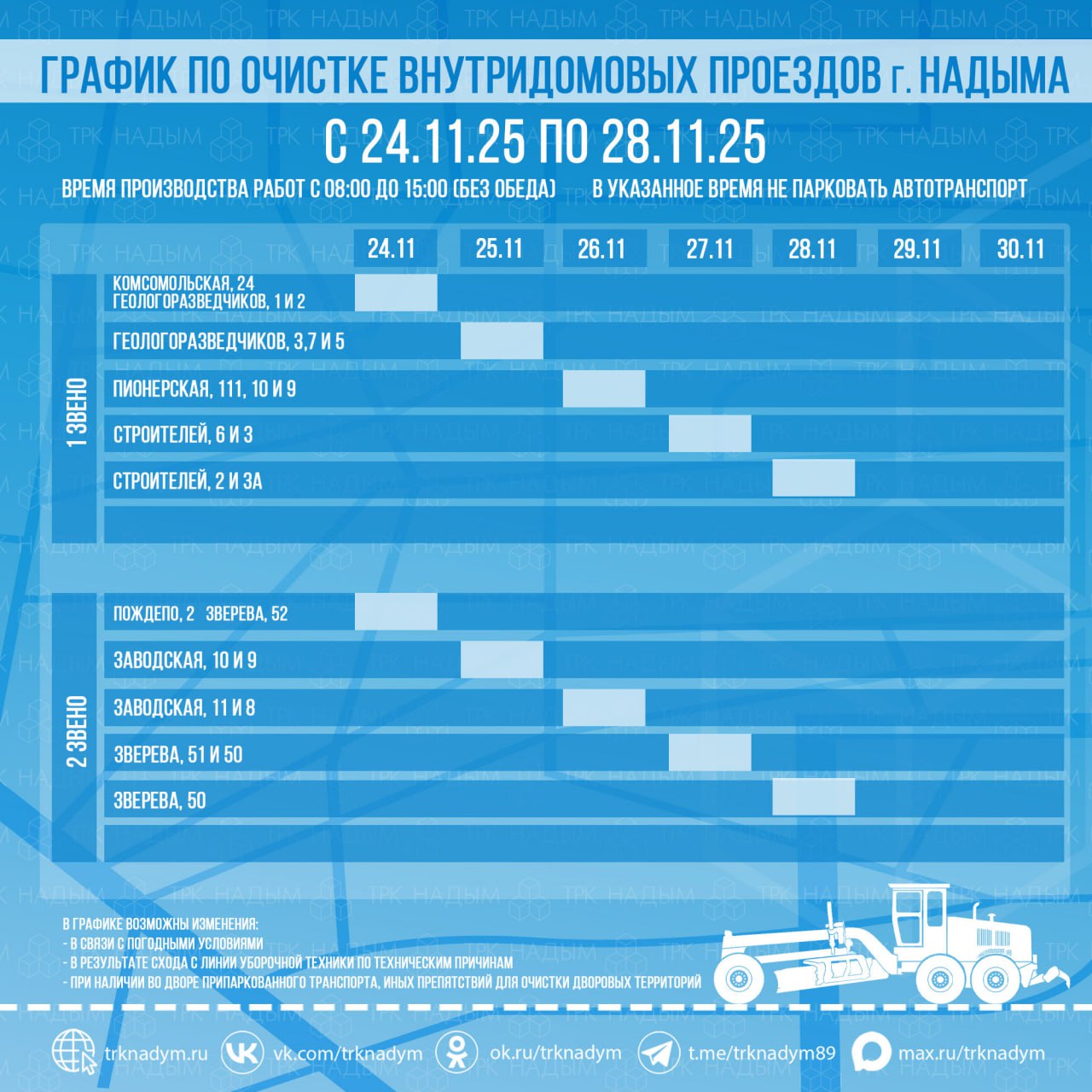График может быть изменён, за актуальной информацией по изменениям на неделе читайте в группе ВКонтакте «Надымгоравтодор».