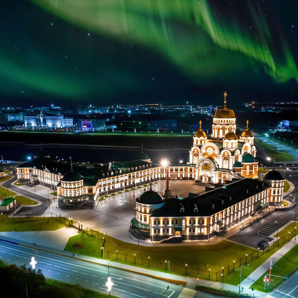 Преображенский собор — один из самых впечатляющих архитектурных объектов Ямала, его высота 63 метра и величественные купола видны издалека. Сроительство собора продолжалось 12 лет;