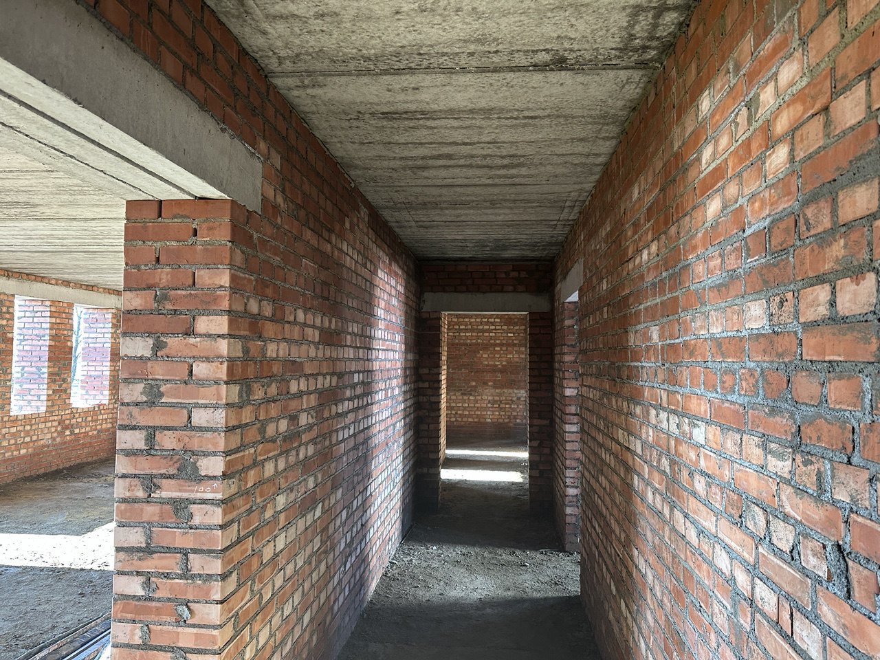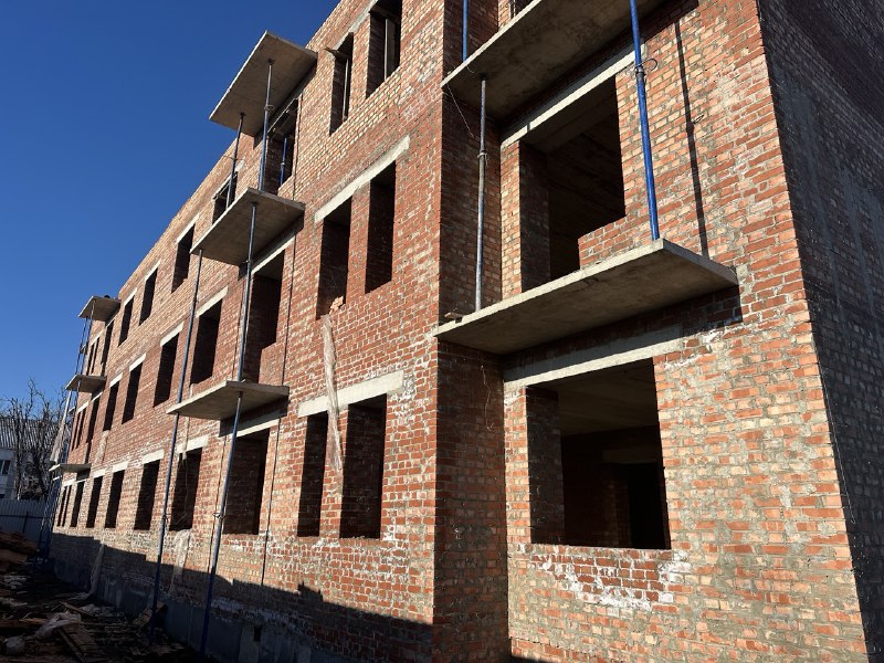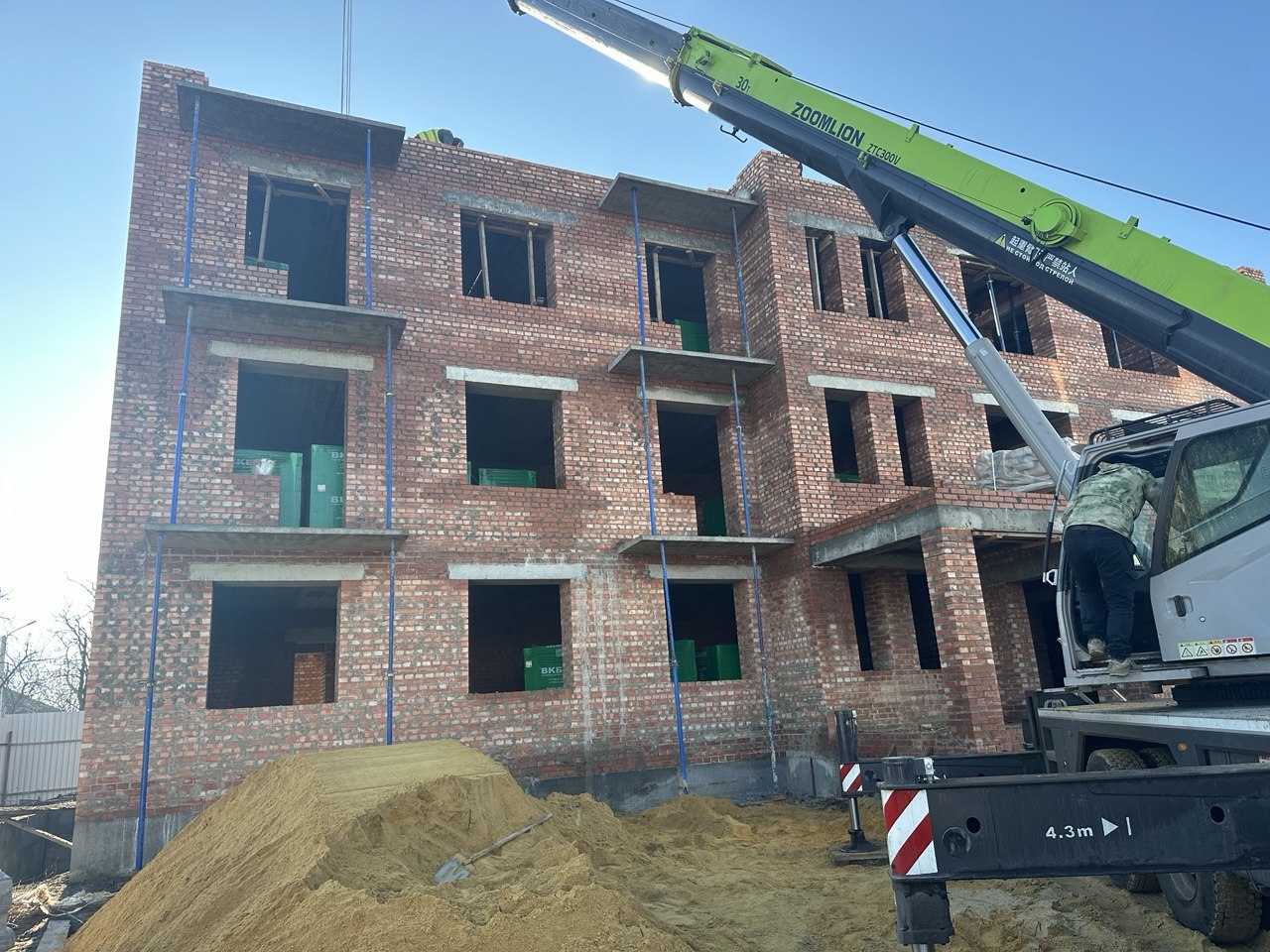 Завершены работы по кладке наружных стен и внутренних перегородок, монтажу бетонных перемычек оконных проемов, а также укладка плит перекрытия на уровне третьего этажа . В доме ведется монтаж монтажу лестничных маршей и лестничных пролетов третьего этажа. Строители приступили к работам по возведению стен четвертого этажа.