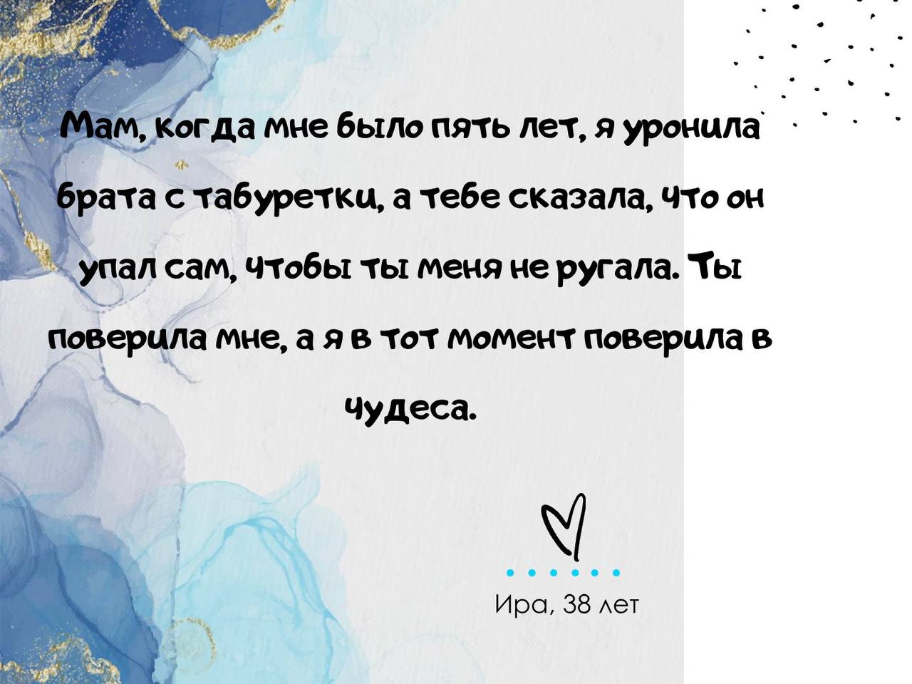 Мы взрослеем, строим свою жизнь, но для неё мы навсегда остаёмся детьми: теми, кому нужно завязать шнурки, кого нужно погладить по голове и выслушать до конца.