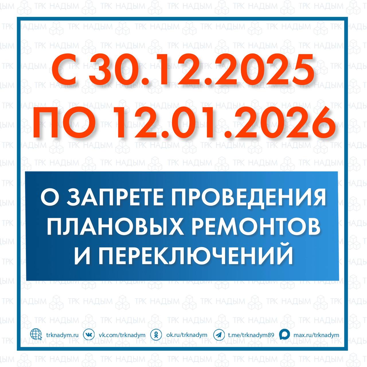 Администрация Надымского района информирует о запрете проведения плановых ремонтов (земляных работ) и переключений, связанных с рисками нарушения энергоснабжения потребителей на территории Надымского района.