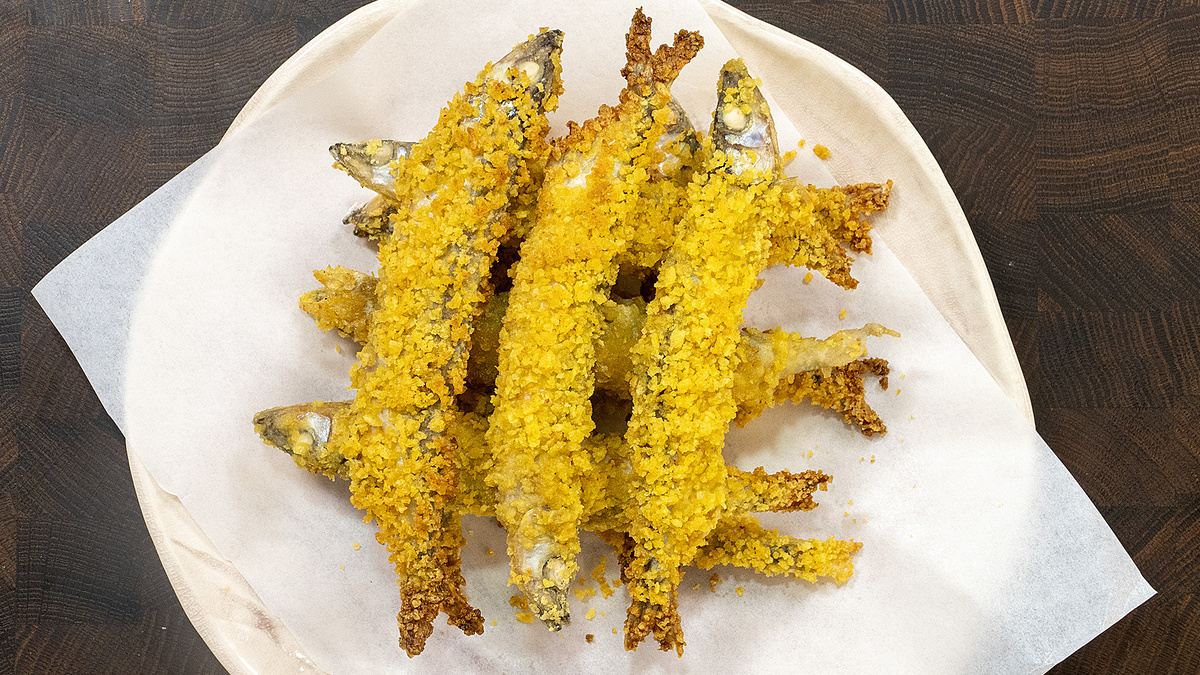 3. Далее обмакните каждую рыбку в взбитых яйцах, а затем обваляйте в измельчённых чипсах, чтобы образовалась аппетитная хрустящая корочка.