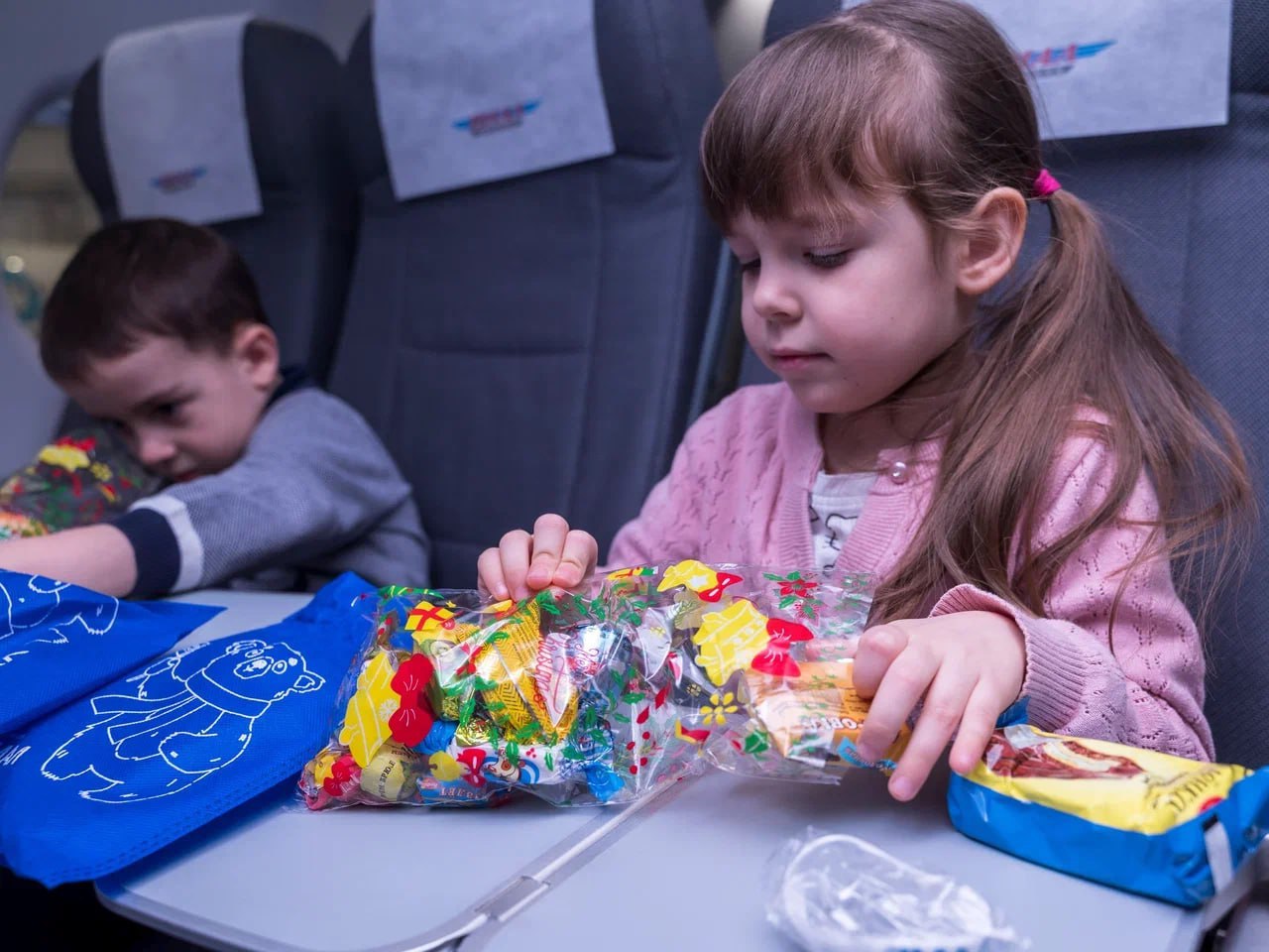 Авиакомпания «Ямал» вручает новогодние сюрпризы маленьким пассажирам прямо в небе. Бортпроводники дарят юным путешественникам наборы со сладостями и фирменным браслетом.