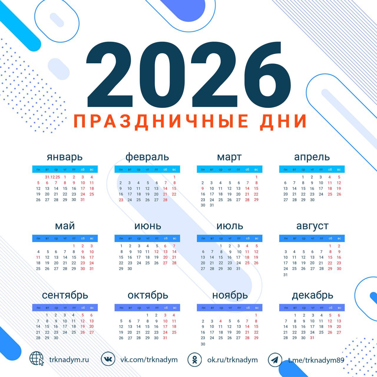 На новогодних каникулах мы будем отдыхать целых 12 дней — с 31 декабря 2025 по 11 января 2026. Хватит времени и на подарки, и на оливье, и на мандарины, и на фильмы, и на встречи, и даже на отдых чуть-чуть останется!