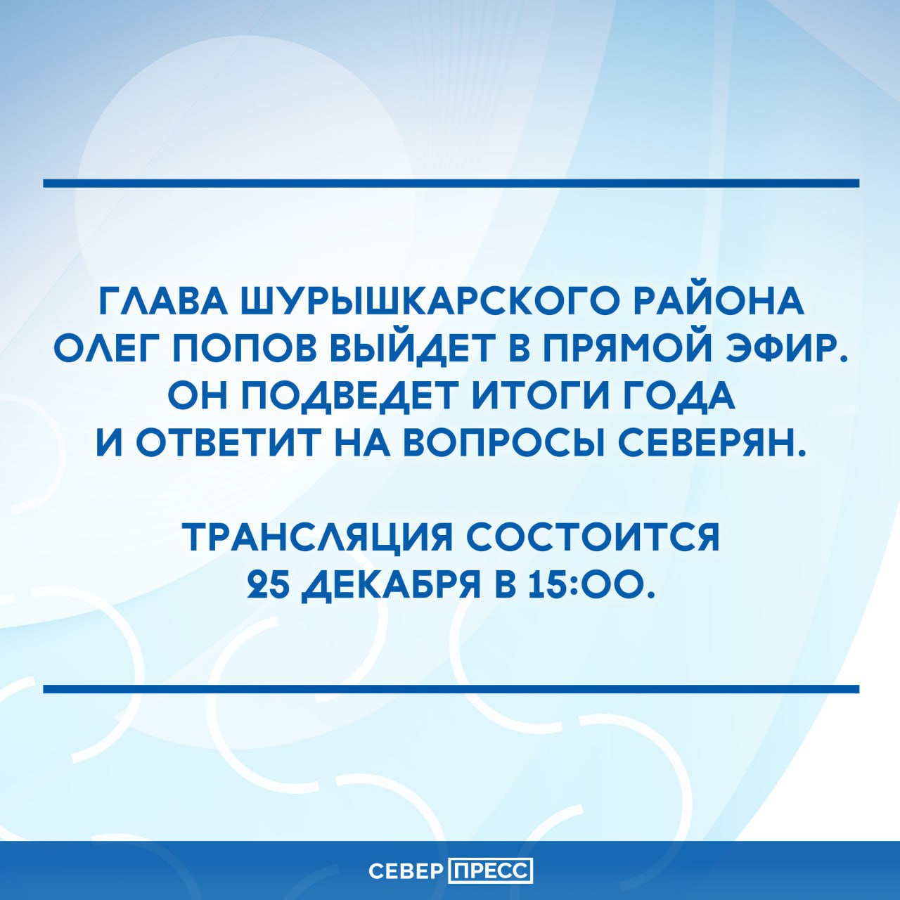 Глава Шурышкарского района сегодня проведет прямой эфир. Олег Попов подведет итоги года и ответит на вопросы северян. Их глава принимает в комментариях под постом в телеграм-канале или в личных сообщениях.