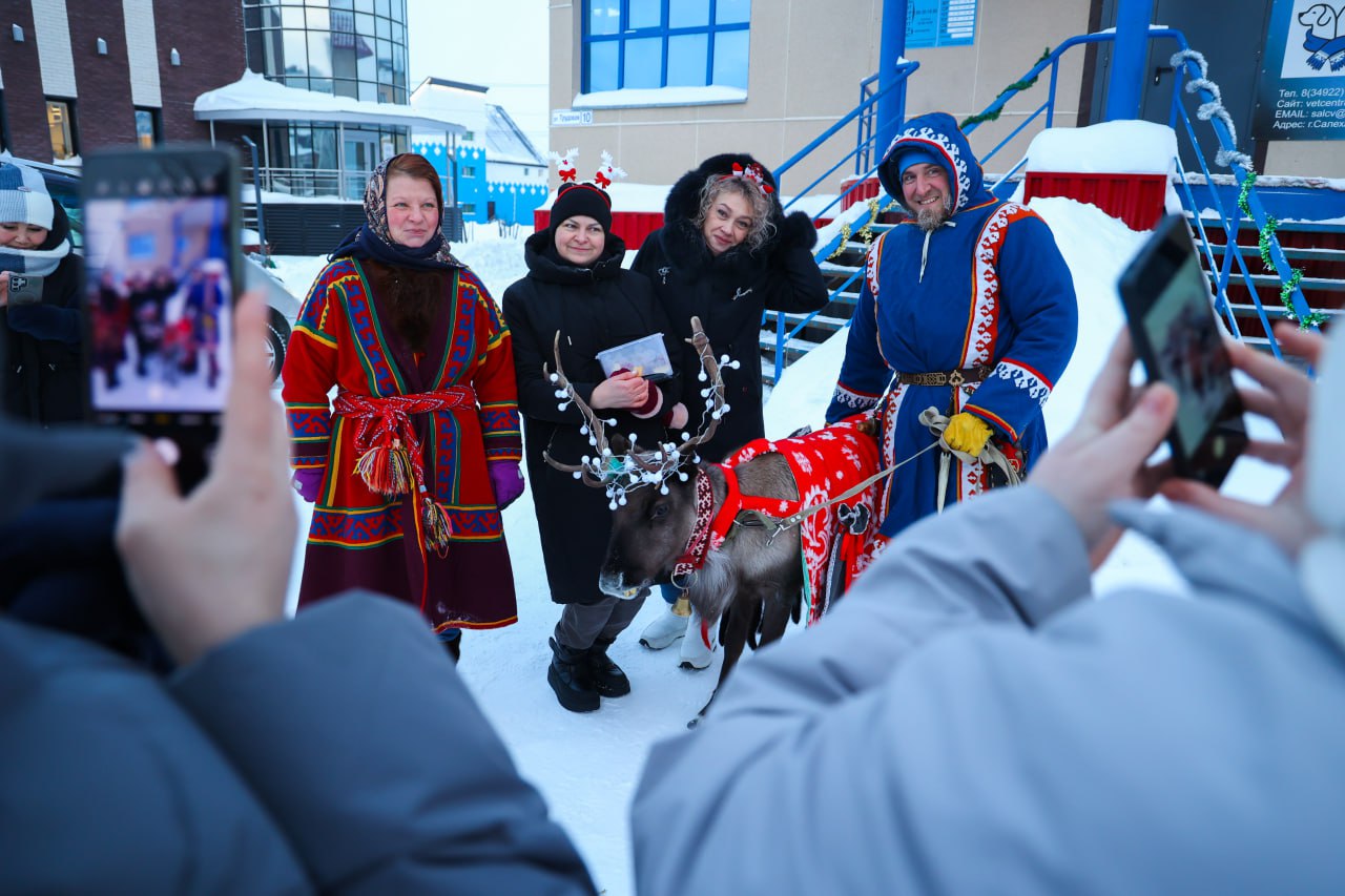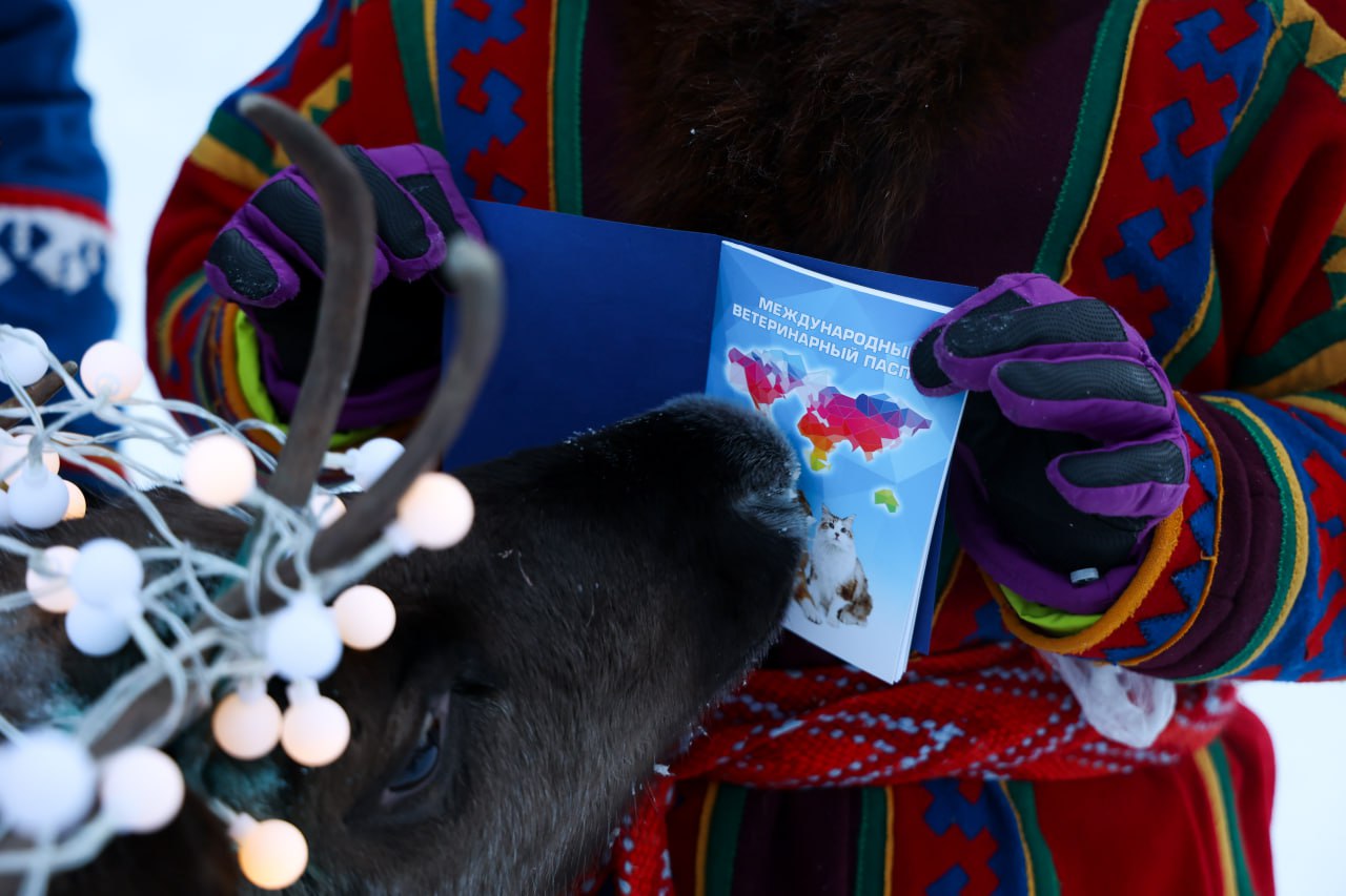 Начальник салехардского отдела Окружного центра ветеринарии Алеся Андросова встретила гостей в костюме Снегурочки. Она вручила оленю Мальчику его первый ветеринарный паспорт.
