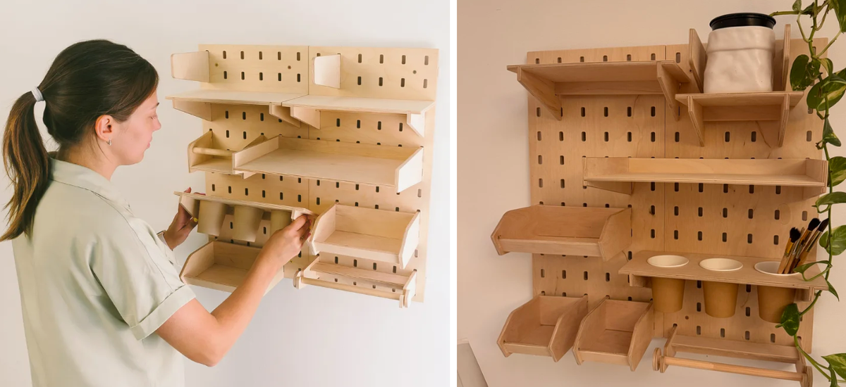 - Пегборд: Идеальное решение для хранения различных принадлежностей. Эта перфорированная доска с полочками и крючками позволяет создать организованное пространство как на кухне, так и в прихожей. Пегборд можно легко покрасить, чтобы он гармонировал с интерьером.