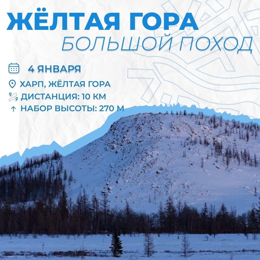 4 января жителей Ямала приглашают провести день на свежем воздухе и открыть новый год активным путешествием. Центр активного отдыха и туризма организует поход на Жёлтую гору — маршрут подойдёт даже тем, кто только делает первые шаги в туризме.