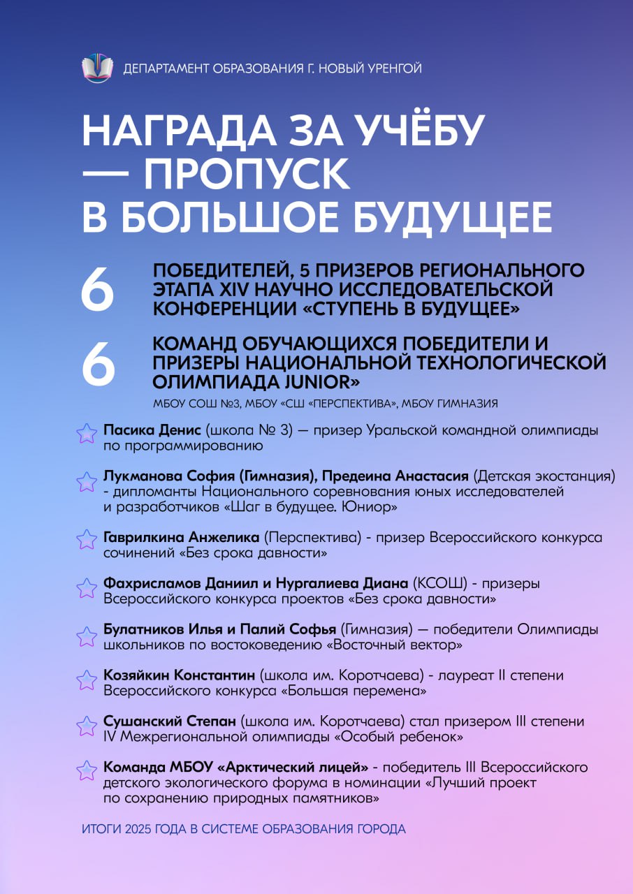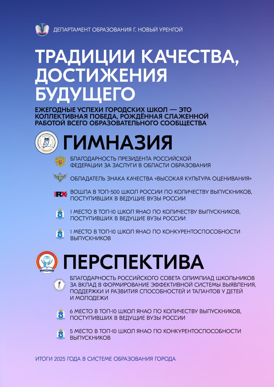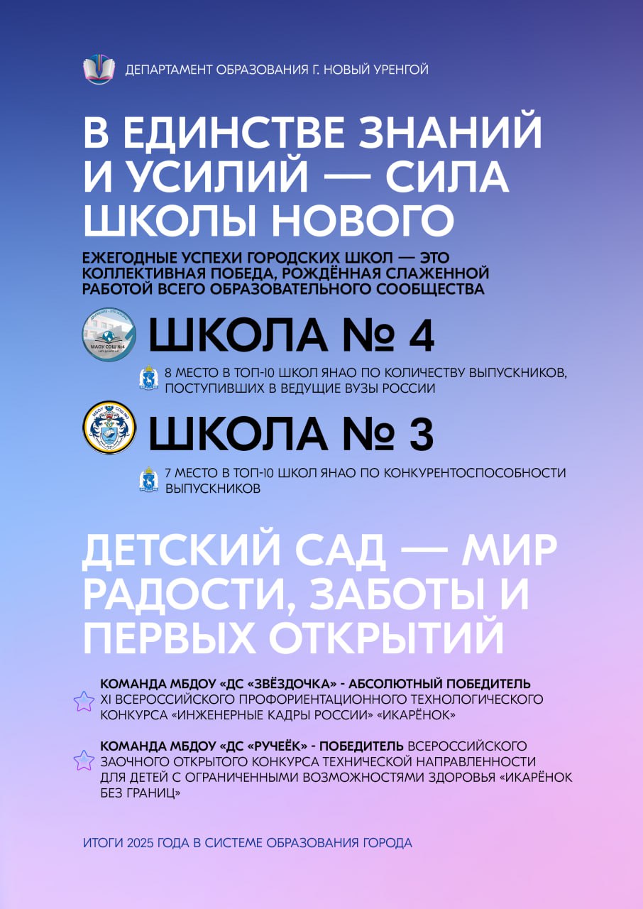 Сердечно благодарим и наших учеников — любознательных, талантливых, целеустремлённых. Ваши успехи, творческие находки и неугасимый интерес к познанию делают каждый учебный день наполненным смыслом и радостью. Пусть достигнутые результаты станут прочной основой для будущих свершений, а полученный в стенах образовательных учреждений багаж знаний и навыков поможет уверенно идти по жизненному пути. Вместе мы доказали: образование Нового Уренгоя — это пространство возможностей, где каждый может реализовать свой потенциал и добиться выдающихся результатов.