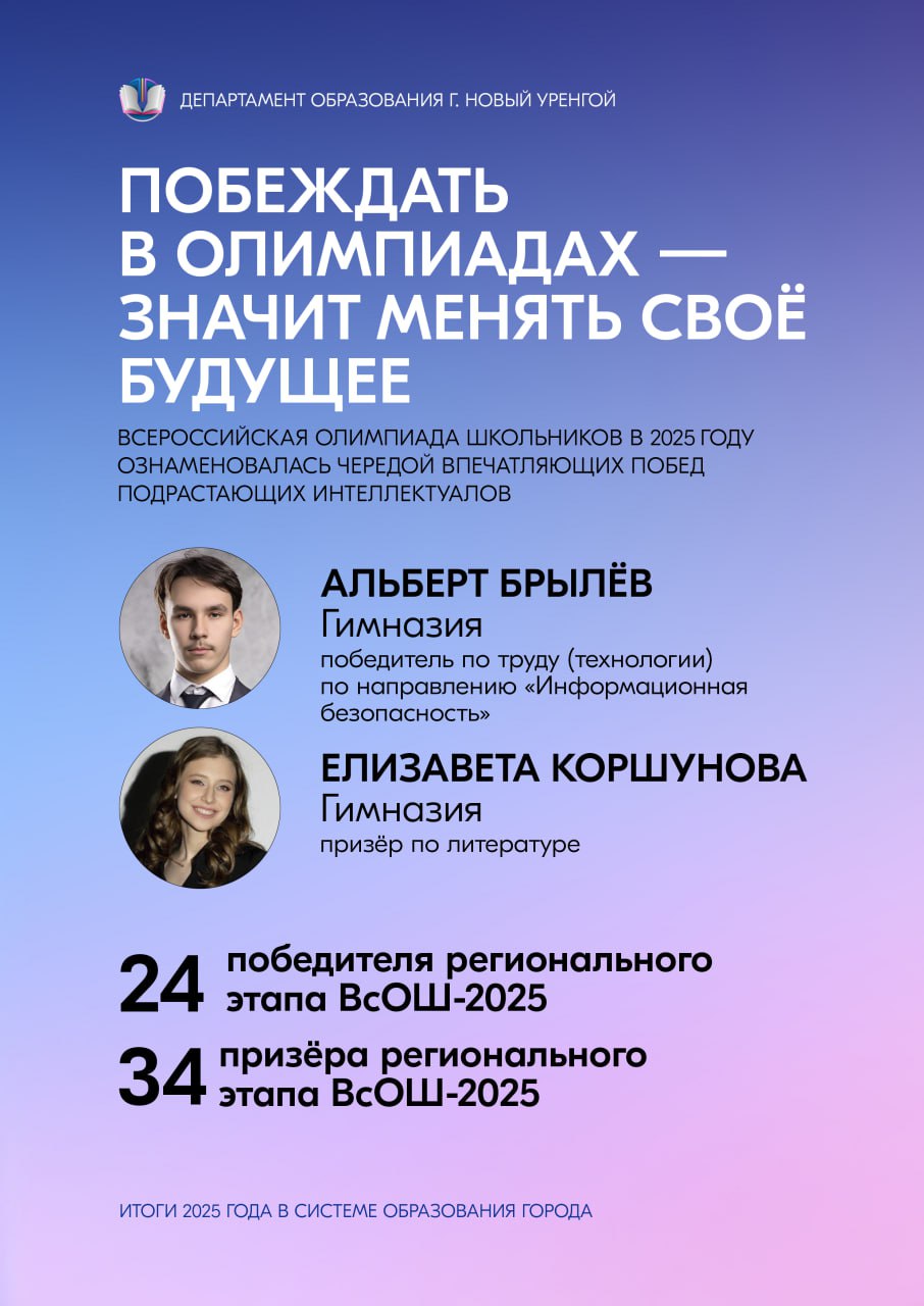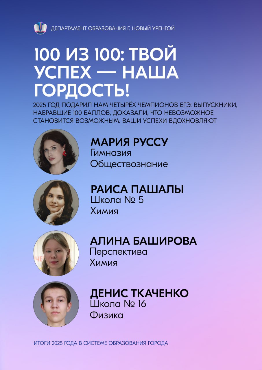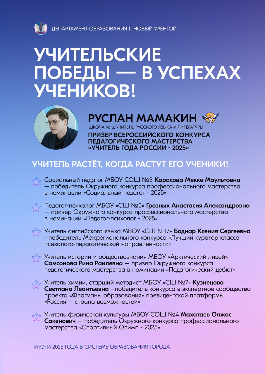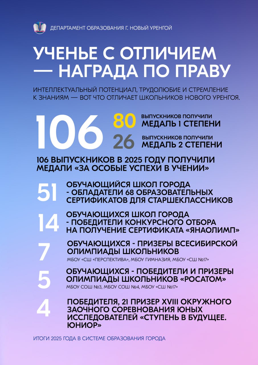 Сердечно благодарим и наших учеников — любознательных, талантливых, целеустремлённых. Ваши успехи, творческие находки и неугасимый интерес к познанию делают каждый учебный день наполненным смыслом и радостью. Пусть достигнутые результаты станут прочной основой для будущих свершений, а полученный в стенах образовательных учреждений багаж знаний и навыков поможет уверенно идти по жизненному пути. Вместе мы доказали: образование Нового Уренгоя — это пространство возможностей, где каждый может реализовать свой потенциал и добиться выдающихся результатов.