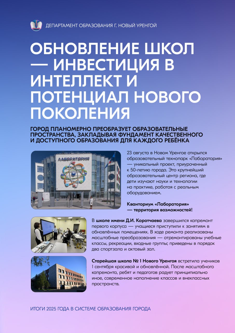Для системы образования Нового Уренгоя этот период стал временем значимых достижений, реализации смелых инициатив и подтверждения высокого профессионального уровня педагогов. Мы с гордостью оглядываемся на проделанную работу: успешные выступления учащихся на олимпиадах и конкурсах, внедрение современных образовательных технологий, укрепление материальнотехнической базы школ и детских садов.