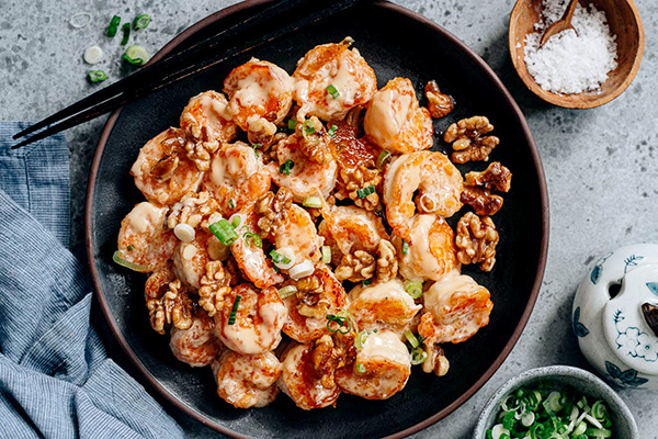 Финальные шаги: Креветки обваливаются в кукурузном крахмале и обжариваются до золотистой корочки. Они выкладываются на тарелку и остывают. Затем в глубокой миске они перемешиваются с соусом и половиной карамелизированных орехов. Блюдо подается на стол, украшенное оставшимися орехами и зелёным луком.
