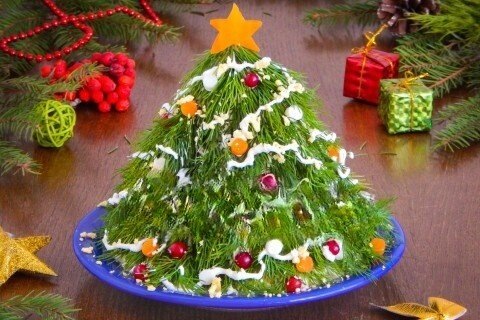 Наконец, пришло время превратить ваше кулинарное творение в настоящую новогоднюю красоту. Из оставшейся половины моркови с помощью специальных инструментов для карвинга вырежьте маленькие шарики и звезду. Сформируйте из салата конус, который будет напоминать елку, и украсите его веточками укропа, создавая иллюзию елочных лапок. На верхушку установите звездочку на зубочистке, окаймляя все это нитями майонеза. Завершите оформление, добавив морковные шарики и яркие ягоды клюквы. И вот, волшебная елочка на вашем столе готова!»