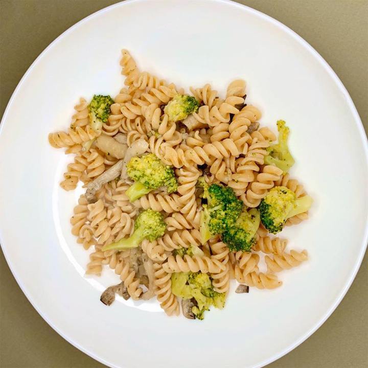 Первым делом следует промыть брокколи и разделить его на соцветия. Поставить варить на 5 минут, затем откинуть на дуршлаг. Параллельно готовить нутовые макароны согласно инструкции – достаточно 5 минут, после чего тоже откинуть на дуршлаг.