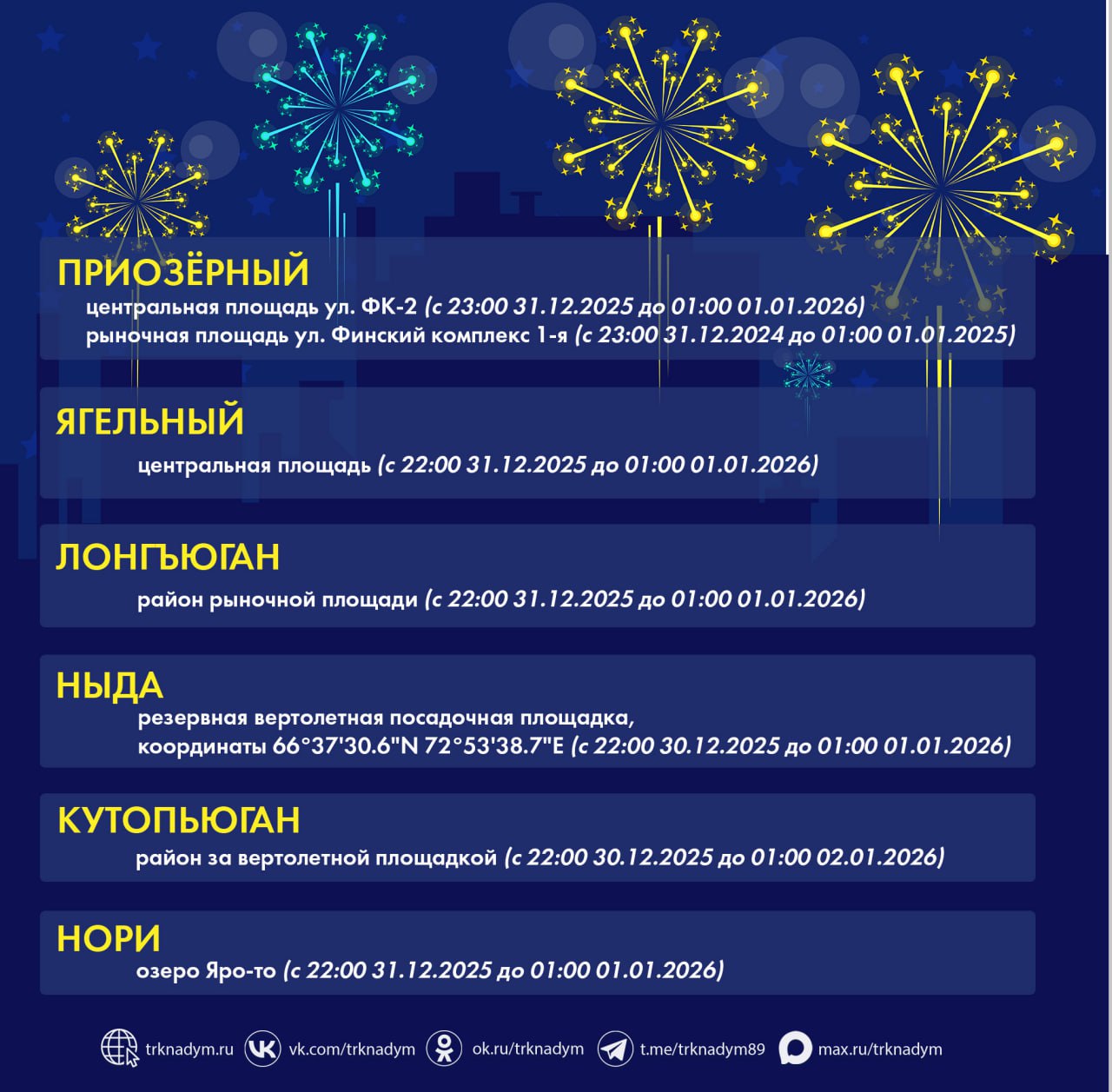 Площадки для запусков в Надыме будут работать круглосуточно с 26 декабря по 14 января. В посёлках - с 22:00 31 декабря до 1:00 1 января.