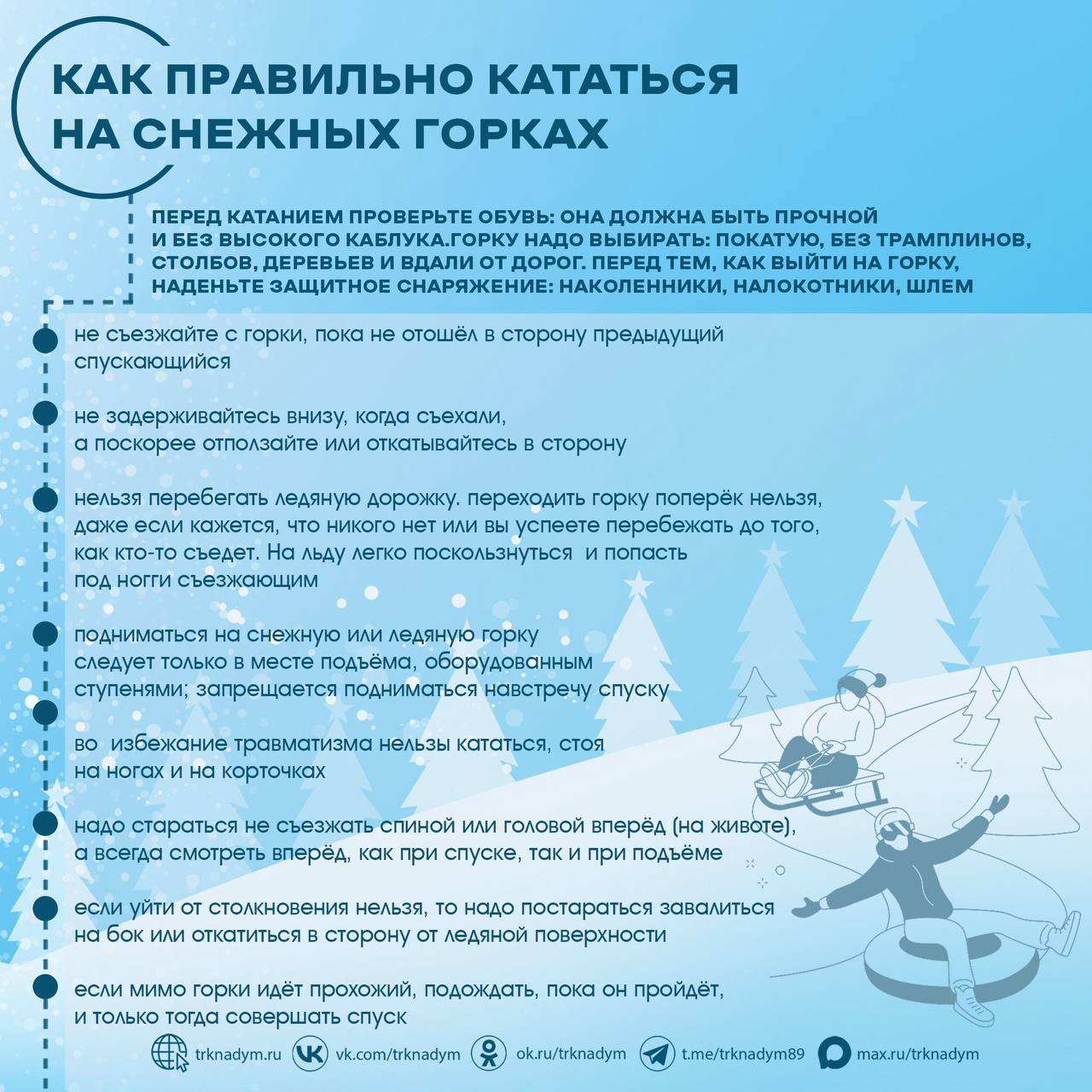 Мы подготовили для вас специальные карточки с рекомендациями, которые помогут избежать травм и других неприятностей во время зимнего отдыха.