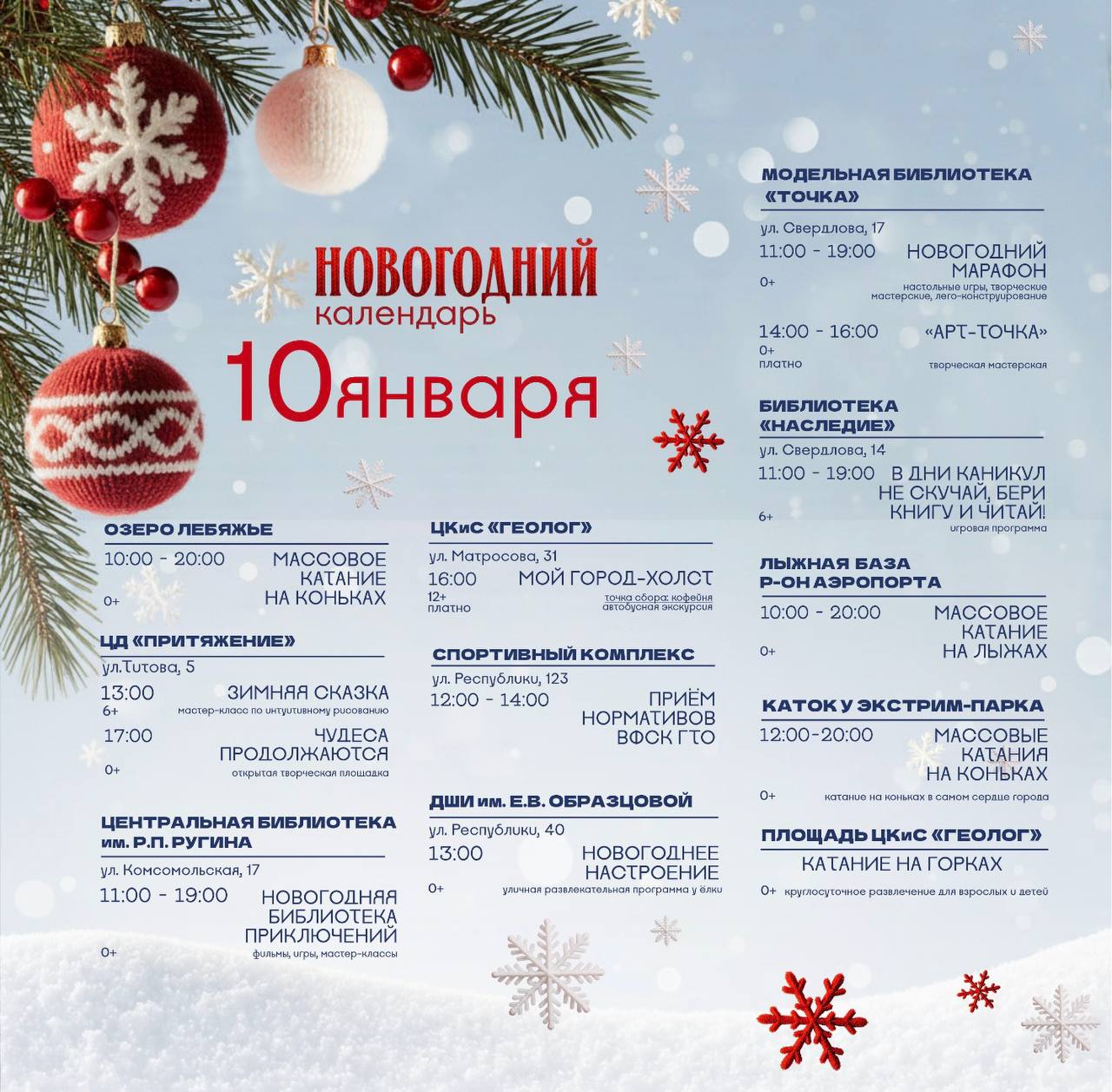 И, конечно же, с 10:00 до 20:00 массовые катания на лыжной базе. А также - катания на коньках у Экстрим-парка, на озере Лебяжье и на площадке по ул. Чкалова.
