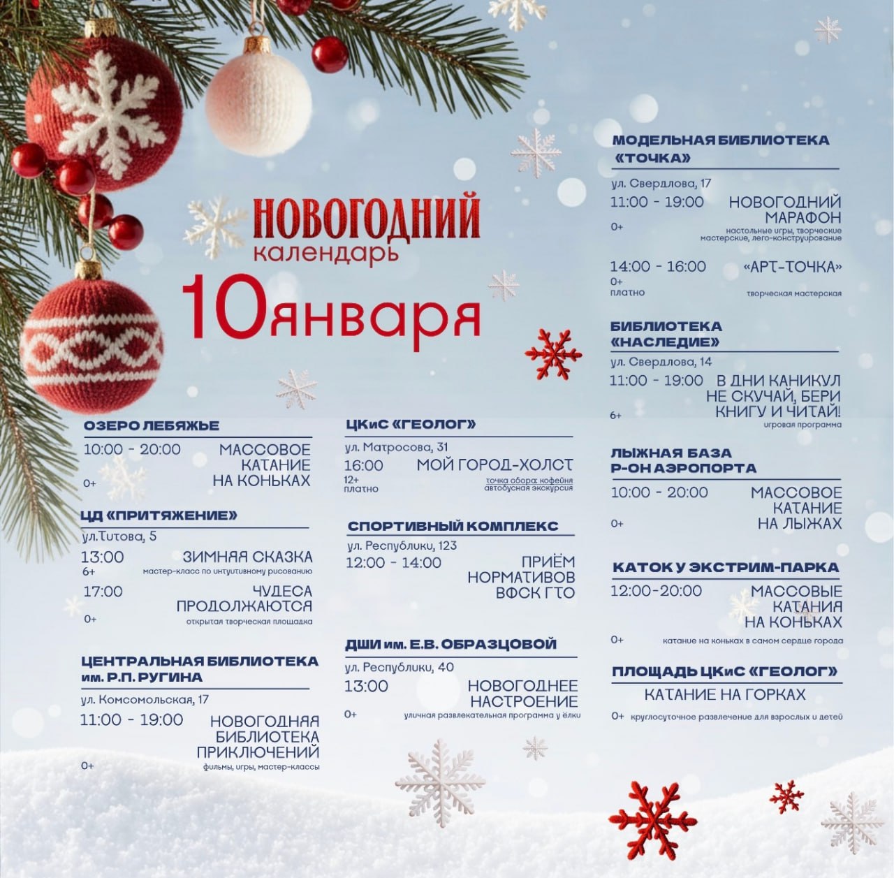 Завтра будет тепло!Самое время для зимнего драйва. Наши предложения:Экстрим-парк и площадь у «Геолога»Каток и горка помогут вам зарядиться адреналином и весельем на свежем воздухе.«Новогодний марафон»Модельная библиотека «Точка» (ул....