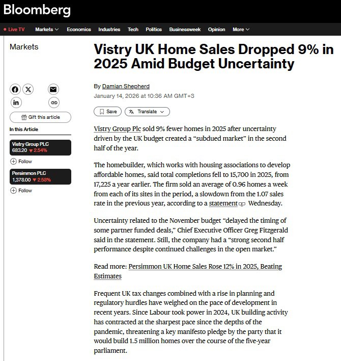 Продажи новых домов в 2025 году сократились на 9%. Ключевой причиной спада стала неопределенность, вызванная ожиданием госбюджета, сообщила одна из крупнейших британских строительных компаний Vistry Group Plc.
