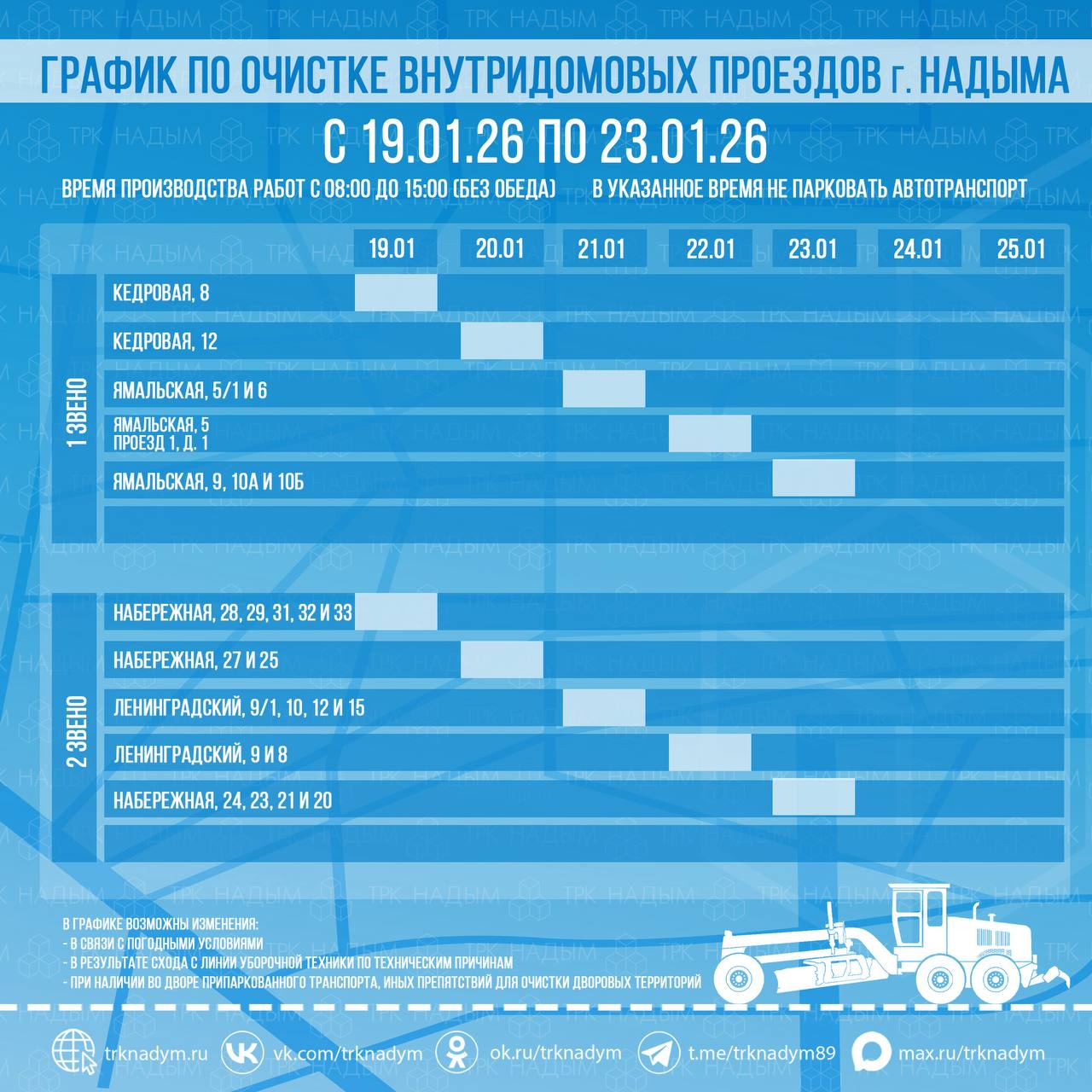 График может быть изменён, за актуальной информацией по изменениям на неделе читайте в группе ВКонтакте «Надымгоравтодор».