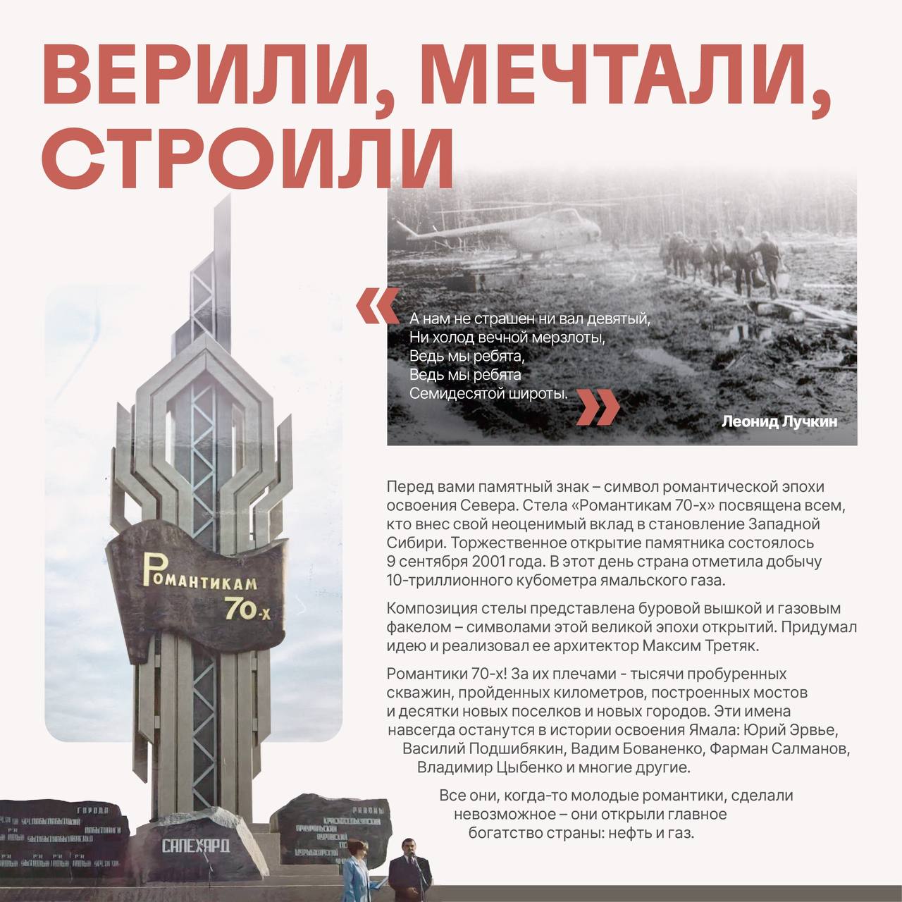 В сквере «Романтикам 70-х» установят информационные стенды, посвящённые подвигу первопроходцев и истории освоения Арктики. Каждый стенд рассказывает о том, как в суровых северных условиях формировался не просто Ямал, а характер людей.