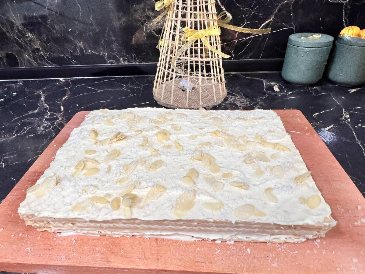 3. Завершение и декор: После укладки всех коржей и их покрытия кремом, завершите оформление десерта путем посыпания его лепестками миндаля и кокосовой стружкой. Если хотите, добавьте для украшения измельченные орехи или цукаты.