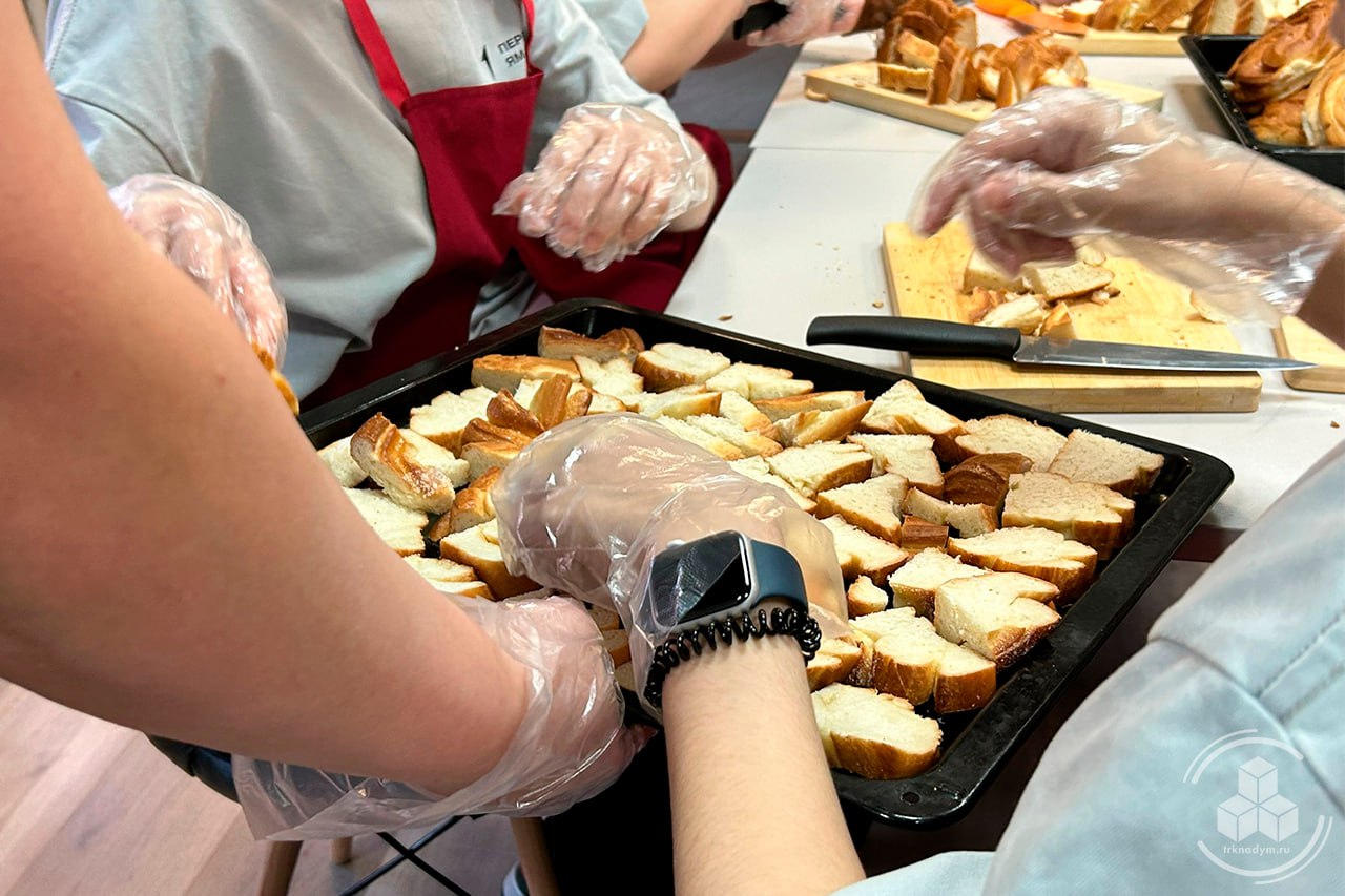 В рамках месяца гражданско-патриотического воспитания прошла особенная акция. Участники мероприятия собрали хлеб и булочки, нарезали их на заготовки для будущих чипсов, под руководством учителя технологии высушили их, упаковали и украсили специальными наклейками.