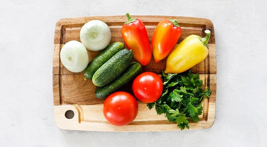 Сладкий перец нарезаем крупной соломкой, помидоры разрезаем на дольки, огурцы подготавливаем в кружках, лук шинкуем, зелень режем крупно. В одном тазике соединяем все овощи и подчеркиваем баланс вкуса солью, сахаром и уксусом, чтобы овощи отдали свой сок равномерно.