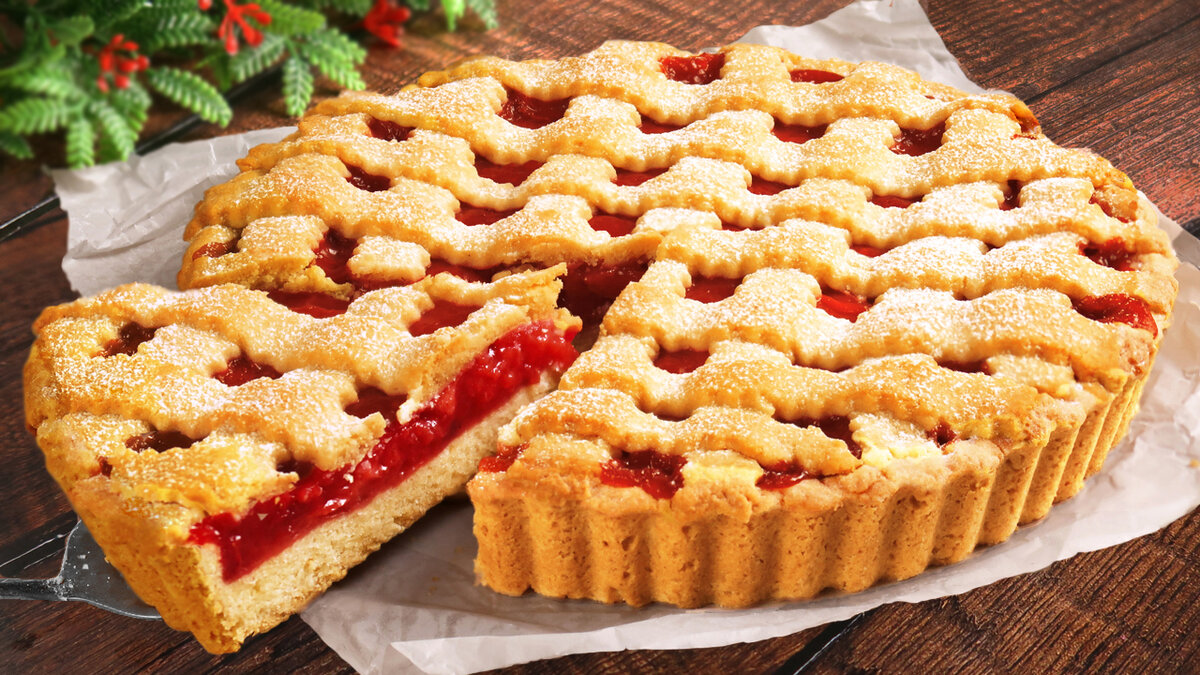 Из общей массы отсекают треть, убирают в холодильник на короткое охлаждение, после чего оставшееся тесто выкладывают в форму и формируют бортики. Добавляют охлажденную начинку, а сверху раскатывают остаток теста, нарезают полосками и аккуратно укладывают поверх пирога.